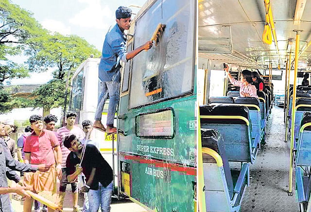 அதிலிருந்து மாறுபட்டு கேரள மாணவர்கள் அரசு பேருந்துகளை தூய்மைப் படுத்தி பலதரப்பினரிடையே பாராட்டை பெற்றிருக்கிறார்கள். அவர்கள் எர்ணா குளத்திலுள்ள மகாராஜா கல்லூரியைச் சேர்ந்தவர்கள். என்.எஸ்.எஸ். தினத்தை வித்தியாசமாக கொண்டாட முடிவு செய்தவர்கள், எர்ணாகுளம் அரசு பஸ் டெப்போவுக்கு சென்று அங்கு நிறுத்திவைக்கப்பட்டிருந்த பேருந்துகளை சுத்தப்படுத்தி இருக்கிறார்கள். பஸ்சின் இருக்கைகள், ஜன்னல்கள், பக்கவாட்டு, முகப்பு கண்ணாடிகளை தண்ணீர் ஊற்றி கழுவி தூய்மைப்படுத்தி இருக்கிறார்கள்.