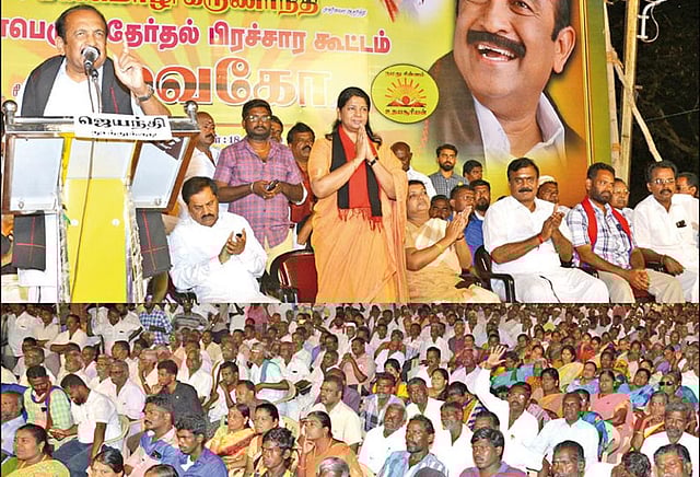 முன்னதாக, ஸ்ரீவைகுண்டம், ஆழ்வார்திருநகரி, திருச்செந்தூர், காயல்பட்டினம், ஆறுமுகநேரி, ஆத்தூர், முக்காணி உள்ளிட்ட பகுதிகளில் வைகோ திறந்த வேனில் சென்று கனிமொழி எம்.பி.க்கு ஆதரவாக பிரசாரம் செய்தார். அப்போது அவர் பேசுகையில், ஒடுக்கப்பட்ட மக்களுக்காகவும், அவர்களின் உரிமைகளுக்காகவும், மாநிலங்களவையிலே குரல் கொடுத்த கனிமொழியின் குரல், மக்களவையிலும் ஒலிக்க வேண்டும். பாசிச பா.ஜனதா அரசும், எதிலும் ஊழல் செய்த அ.தி.மு.க. அரசும் இணைந்து, எல்லா துறைகளிலும் தமிழக மக்களை வஞ்சித்து விட்டது. நாட்டில் சமூக நீதி, இட ஒதுக்கீடு, ஜனநாயகம், மதசார்பற்ற தன்மை அழிக்கப்பட்டு குழி தோண்டி புதைக்கப்பட்டது. சரக்கு, சேவை வரி விதிப்பு, உயர் பணமதிப்பு இழப்பு போன்ற தவறான பொருளாதார கொள்கைகளால் சிறு குறு தொழில்கள் அழிந்தன. எனவே மத்தியில் மதசார்பற்ற அரசு அமைய, பாசிச ஆட்சி அகற்றப்பட தி.மு.க. வேட்பாளர் கனிமொழிக்கு உதயசூரியன் சின்னத்தில் வாக்களித்து அமோக வெற்றி பெறச் செய்யுங்கள் என்றார்.