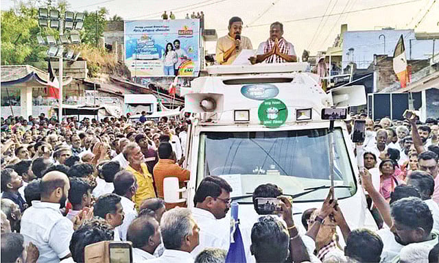 ஸ்ரீவைகுண்டத்தில் பிரசாரம்: தொடர்ந்து ஸ்ரீவைகுண்டம் தொகுதி அ.தி.மு.க. வேட்பாளர் எஸ்.பி. சண்முகநாதனை ஆதரித்து பிரசாரம் செய்த டி.டி.வி. தினகரன், "2021-ல் நாங்கள் பிரிந்து இருந்ததால் தி.மு.க. வெற்றி பெற்றது. இப்போது கருத்து வேறுபாடுகளை தூக்கி எறிந்துவிட்டு, மக்கள் விரோத தி.மு.க.வை வீழ்த்த இணைந்துள்ளோம். எடப்பாடி பழனிசாமி தலைமையில் தேசிய ஜனநாயக கூட்டணியின் ஆட்சி அமையும்" என்று பேசினார். மேலும் அவர், ஸ்ரீவைகுண்டம் பகுதியில் 25,000 ஏக்கரில் நடைபெறும் வாழை சாகுபடியை கருத்தில் கொண்டு, வாழை சார்ந்த பிரத்யேக சந்தை அமைக்கப்படும் என்றும் உறுதி அளித்தார்.