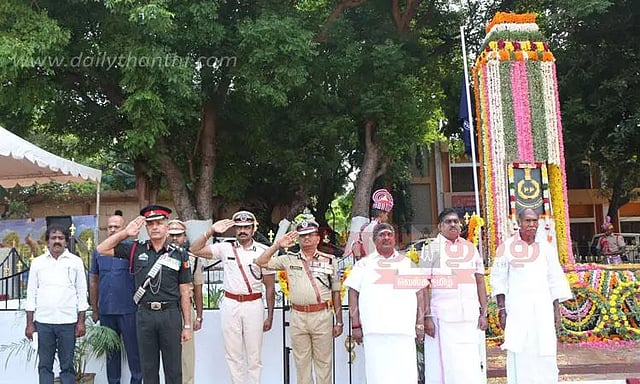 அதைத்தொடர்ந்து 2 நிமிடம் மவுன அஞ்சலி செலுத்தப்பட்டது. தொடர்ந்து போலீசார் 21 குண்டுகள் முழங்க மரியாதை செலுத்தினார்கள். அத்துடன் நிகழ்ச்சிகள் நிறைவடைந்தன.