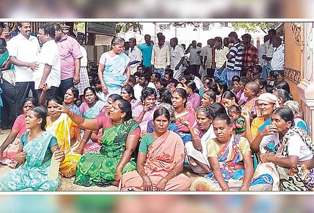 இதுகுறித்து தாசில்தாரை சந்தித்து புகார் மனு அளிப்பதற்காக கிராம மக்கள் ஒன்று திரண்டு காட்டுமன்னார் கோவில் தாலுகா அலுவலகத்திற்கு வந்தனர். அப்போது தாசில்தார் சிவகாமசுந்தரி அங்கு இல்லை. இதனால் ஆத்திரமடைந்த கிராம மக்கள் தாலுகா அலுவலகத்தை முற்றுகையிட்ட அவர்கள், நுழைவு வாயில் முன்பு அமர்ந்து தர்ணா போராட்டத்தில் ஈடுபட்டனர்.