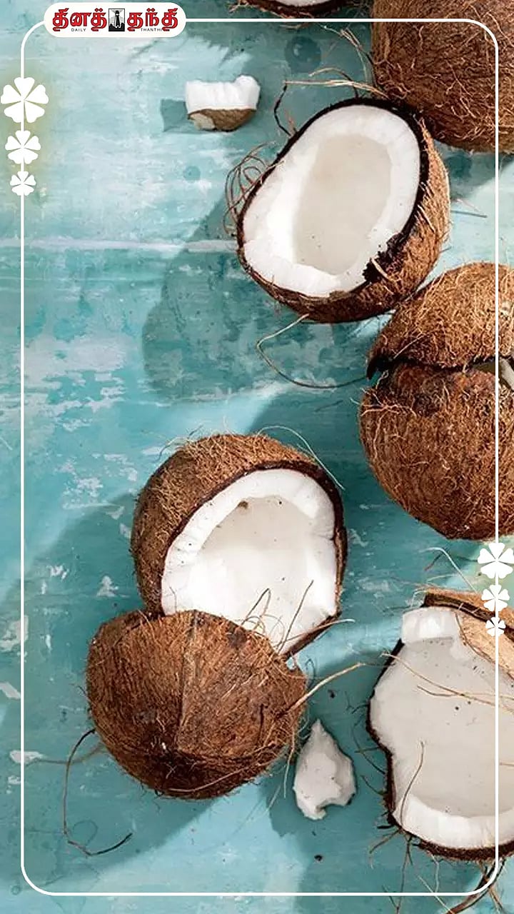 தேங்காயில் லாரிக் அமிலம் நிறைந்துள்ளது. இது ரத்தத்தில் நல்ல கொழுப்பை அதிகரித்து, இதய ஆரோக்கியத்தை மேம்படுத்துகிறது..கெட்ட கலோரிகளை எரித்து ஆரோக்கியமான எடை மேலாண்மைக்கு வழிவகுக்கிறது..ரத்தத்தில் சர்க்கரை அளவைக் கட்டுப்படுத்தவும், நோய் எதிர்ப்பு சக்தியை அதிகரிக்கவும் உதவுகிறது..தேங்காய் உடலில் ஆக்ஸிஜனேற்ற அழுத்தத்தை எதிர்த்துப் போராட உதவும் பீனாலிக் கலவைகளை கொண்டுள்ளது..நார்ச்சத்து நிறைந்துள்ளது, செரிமான ஆரோக்கியத்தை மேம்படுத்துகிறது மற்றும் குடல் இயக்கத்தை ஊக்குவிக்கிறது..தோல் மற்றும் முடி பராமரிப்புக்கும் தேங்காய் முக்கிய பங்காற்றுகிறது.