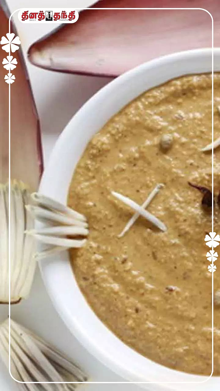 தேவையான பொருட்கள்: வாழைப்பூ - 1 ,கடலைப் பருப்பு - 1 டீஸ்பூன் ,உளுத்தம் பருப்பு - 1 டீஸ்பூன், புளி - எலுமிச்சை அளவு, காய்ந்த மிளகாய் - 4 ,துருவிய தேங்காய் - கால் கப், எண்ணெய் - 3 டீஸ்பூன், கடுகு - 1 டீஸ்பூன், கறிவேப்பிலை - சிறிதளவு, உப்பு - தேவையான அளவு, பெருங்காயத்தூள் - சிறிதளவு