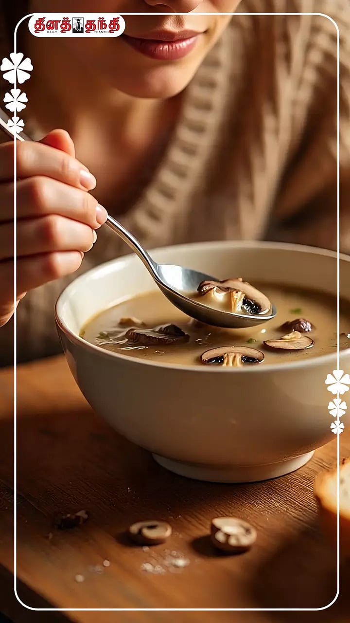 காளான் சூப்பில் வைட்டமின் டி, செலினியம், மற்றும் பிற ஊட்டச்சத்துக்கள் நிறைந்துள்ளன..காளான் சூப் நோய் எதிர்ப்பு சக்தியை அதிகரிக்கலாம்..காளான் சூப் அருந்துவதால் எலும்புகளின் ஆரோக்கியத்தை மேம்படுத்தலாம்..இதில் உள்ள நார்ச்சத்து ,செரிமானத்தை சீராக்க உதவுகிறது..இதில் உள்ள புரதம், வைட்டமின்கள், மற்றும் ஆன்டிஆக்ஸிடன்ட்கள் இதய ஆரோக்கியத்திற்கு நல்லது..காளான் சூப் மார்பகப் புற்றுநோயை தடுக்க உதவும் என குறிப்பிடப்படுகிறது..காய்ச்சலால் உடல் இளைத்தவர்கள் தினமும் காளான் சூப் அருந்தினால் விரைவில் உடல் தேறும்..மலட்டுத்தன்மை, பெண்களுக்கு உண்டாகும் கருப்பை நோய்கள் போன்றவற்றைக் குணப்படுத்துகிறது..Explore