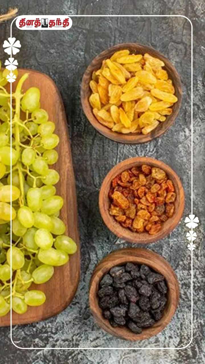 உலர் திராட்சை ப்ரீ ரேடிக்கல்களை அகற்றும் திறன் கொண்டதாகும்..ரத்த அழுத்தத்தைக் கட்டுப்படுத்தும் பண்புகளைக் கொண்டுள்ளது..இதில் உள்ள நார்ச்சத்து குடலை ஆரோக்கியமாக வைத்து மலச்சிக்கல் பிரச்சினையை போக்கும் தன்மைக்கொண்டது..நோயெதிர்ப்பு சக்தியை மேம்படுத்தவும், தொற்றுநோய்களைத் தடுக்கவும் முக்கிய பங்காற்றுகிறது..ரத்த சோகை அபாயத்தைக் குறைக்கும் தன்மைக்கொண்டது..கெட்ட கொழுப்பை குறைத்து இதய ஆரோக்கியத்தை மேம்படுத்துகிறது.