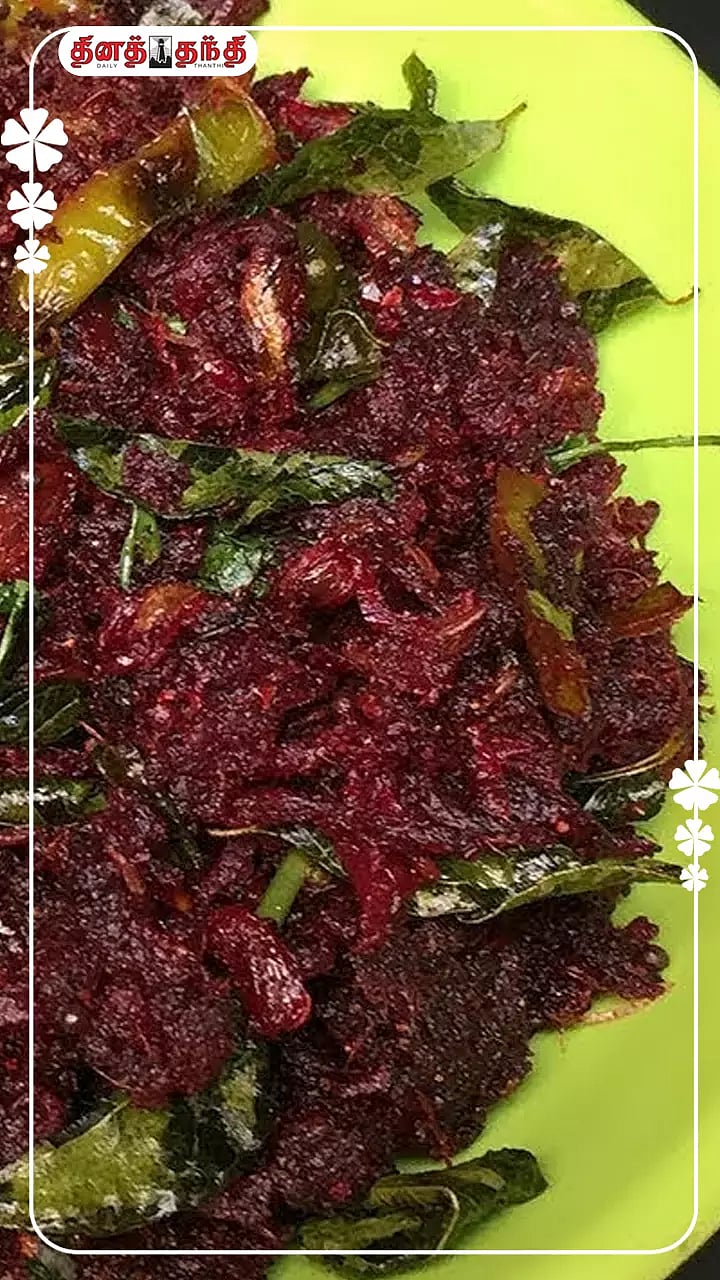 தேவையான பொருட்கள்: தேங்காய் எண்ணெய், பீட்ரூட், பச்சை மிளகாய், கறிவேப்பிலை, கடுகு, உளுத்தம் பருப்பு, பெருங்காயத் தூள், உப்பு, தண்ணீர், துருவிய தேங்காய் ஆகியவை.