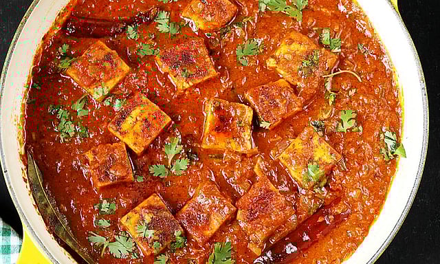 சிறிது தண்ணீர் சேர்த்து 5 நிமிடம் கொதிக்க விடவும். பின்னர் பனீர் துண்டுகளை சேர்த்து மெதுவாக கலக்கி நன்கு வேகவிடவும்.