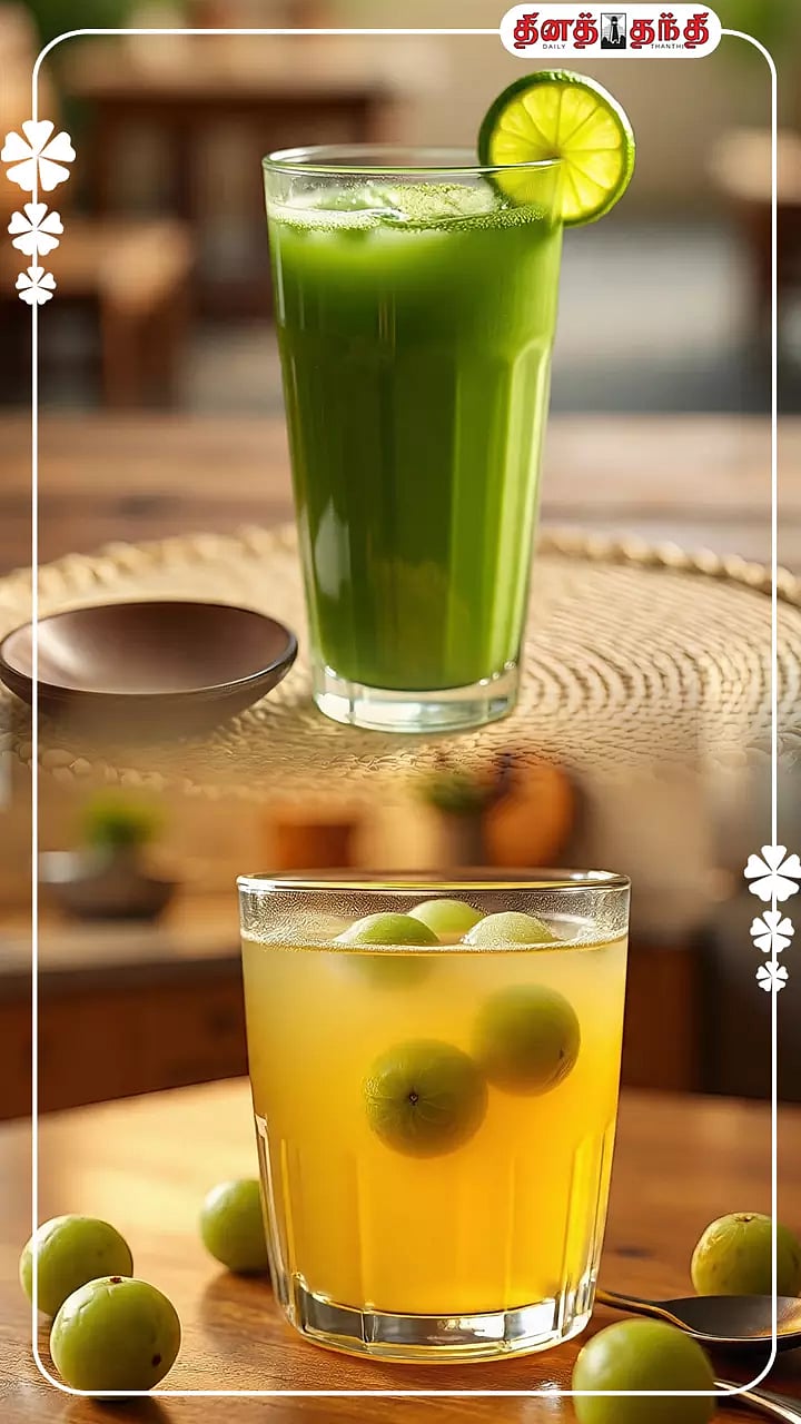 நெல்லிக்காய் சாறு: தலைமுடி உதிர்வது குறையும், தும்மல், இருமல், சளி, கண்நோய், பல் நோய்கள் குறையும். பசியை, நன்கு தூண்டும். நீரழிவு நோய், உடல் பலமின்மை, தோல் நோய்கள் குறையும்