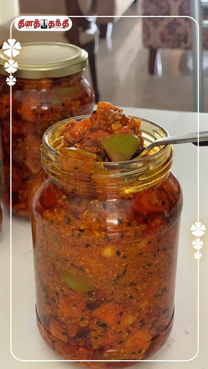 இதனுடன் இரண்டு டேபிள் ஸ்பூன் அளவு மிளகாய் தூள், கடுகு வெந்தயப் பொடியை இதனுடன் சேர்த்து, தேவையான அளவு உப்பு சேர்த்துக் கொள்ள வேண்டும்.