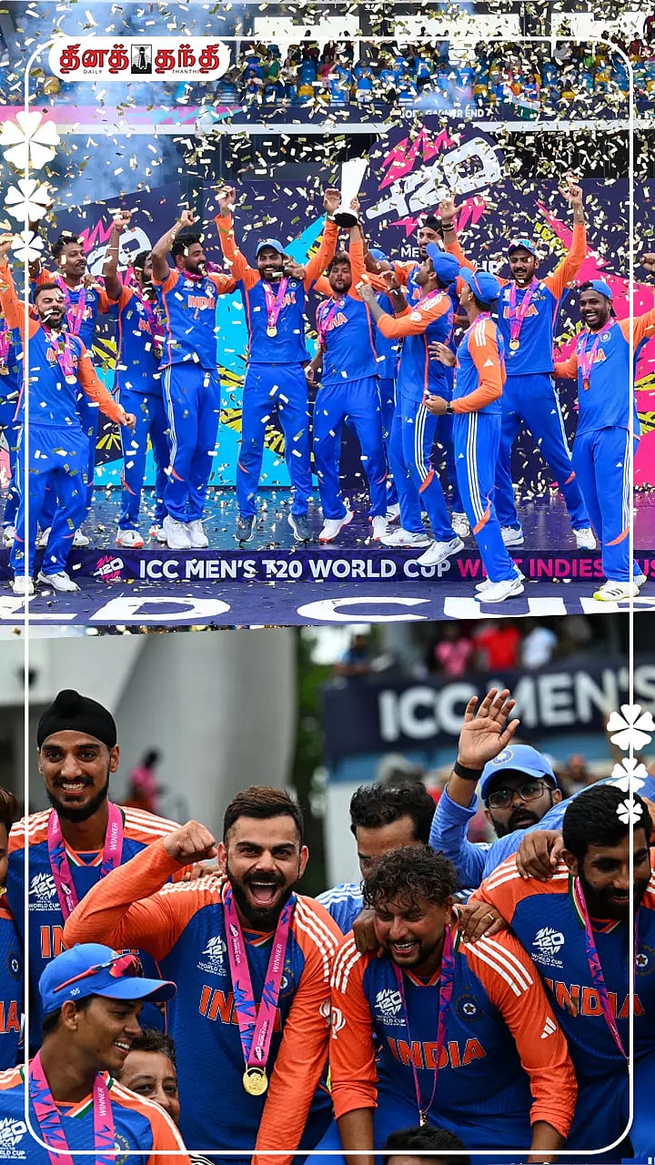 கேப்டன் ரோகித் சர்மா வெற்றிக்கோப்பையை வாங்கிய தருணம்..வெற்றிக்கோப்பையுடன் தலைமை பயிற்சியாளர் ராகுல் டிராவிட் மகிழ்ந்த தருணம்.வெற்றிக்கோப்பையுடன் மகிழ்ந்த இந்திய அணி வீரர்கள்..குரூப் குரூப்பாக புகைப்படம் எடுத்துக்கொண்ட தருணம்..வெற்றிக்கோப்பையுடன் கேப்டன் ரோகித் மற்றும் விராட் கோலி.தேசிய கொடியுடன் கேப்டன் ரோகித் மற்றும் ஹர்திக் பாண்ட்யா.வெற்றிக்கோப்பையுடன் புகைப்படம் எடுத்து மகிழ்ந்த இந்திய வீரர்கள்.வெற்றிக்கோப்பையுடன் விராட் கோலி.வெற்றிக்கோப்பையுடன் கேப்டன் ரோகித் சர்மா