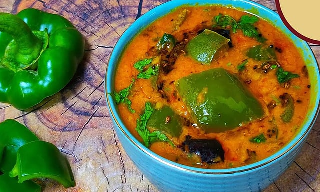 தேவையான பொருட்கள்: துவரம் பருப்பு - 1/2 கப், குடைமிளகாய் - 2 ,சாம்பார் பொடி - 1/2 டேபிள்ஸ்பூன், வெங்காயம், தக்காளி - தலா 1, எண்ணெய் - 1 டீஸ்பூன், கடுகு - 1 டீஸ்பூன், பெருங்காயம் - 1/4 டீஸ்பூன், புலி பேஸ்ட் - 1/4 டீஸ்பூன், கறிவேப்பிலை, கொத்தமல்லி - சிறிதளவு, காய்ந்த மிளகாய் - 5, உப்பு - தேவைக்கேற் நெய் - 1 டீஸ்பூன் ஆகியவை.