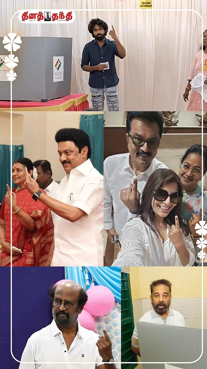 சென்னை தேனாம்பேட்டை எஸ்.ஐ.இ.டி. கல்லூரியில் அமைக்கப்பட்டுள்ள வாக்குச்சாவடியில் முதல்-அமைச்சர் மு.க.ஸ்டாலின் வாக்கினை செலுத்தினார்..எடப்பாடி பழனிசாமி தனது வாக்கினை செலுத்தினார்..அண்ணாமலை தனது வாக்கினை செலுத்தினார்..உதயநிதி ஸ்டாலின் தனது வாக்கினை செலுத்தினார்..கமல்ஹாசன் தனது வாக்கினை செலுத்தினார்..சென்னை ஸ்டெல்லா மேரீஸ் கல்லூரியில் உள்ள வாக்குச்சாவடி மையத்தில் நடிகர் ரஜினிகாந்த் வாக்கினை செலுத்தினார்..நடிகர் கார்த்திக் தனது வாக்கினை செலுத்தினார்..நடிகர் விஜய் சென்னையில் தனது வாக்கினை பதிவு செய்தார்..நடிகர் அஜித்குமார் தனது வாக்கினை சென்னை திருவான்மியூரில் உள்ள வாக்குச்சாவடியில் செலுத்தினார்..நடிகர் சூர்யா சென்னை தியாகராய நகரில் உள்ள இந்தி பிரசார சபாவில் வாக்கினை செலுத்தினார்..நடிகர் யோகிபாபு தனது வாக்கினை செலுத்தினார்..நடிகை திரிஷா சென்னை ஆழ்வார்பேட்டையில் உள்ள பள்ளியில் தனது வாக்கினை பதிவு செய்தார்..நடிகர் விஜய் சேதுபதி சென்னையில் தனது வாக்கினை பதிவு செய்தார்..நடிகர் ஜி.வி பிரகாஷ் தனது வாக்கினை செலுத்தினார்.