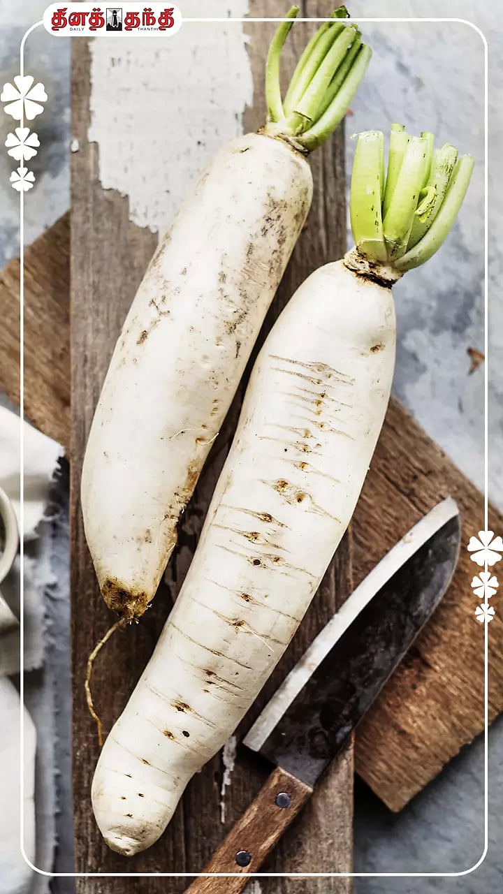 முள்ளங்கியில் நார்ச்சத்து அதிகம் உள்ளதால், செரிமான அமைப்பை சீராக வைத்திருக்க உதவுகிறது..முள்ளங்கி கல்லீரல் ஆரோக்கியத்தை பாதுகாக்கக்கூடிய ஊட்டச்சத்துக்கள் மற்றும் ஆன்டிஆக்ஸிடன்ட்கள் நிறைந்தது..முள்ளங்கியில் வைட்டமின் சி நிறைந்துள்ளது. இது உடலில் நோய் எதிர்ப்பு சக்தியை அதிகரிக்க செய்கிறது..முள்ளங்கியில் கலோரிகள் குறைவாகவும், நார்ச்சத்து அதிகமாகவும் உள்ளது. இது உடல் எடை குறைப்புக்கு வழிவகுக்கும்..இதில் உள்ள பொட்டாசியம் ரத்த அழுத்தத்தைக் குறைக்கவும், ரத்த ஓட்டத்தை கட்டுப்பாட்டில் வைக்கவும் உதவுகிறது..முள்ளங்கியில் நிறைந்துள்ள அதிக நீர்ச்சத்து, சருமத்தை நீரேற்றமாக வைப்பதன் மூலம், சரும ஆரோக்கியத்தை பாதுகாக்கிறது..இதில் ஆன்டி-ஆக்ஸிடன்ட்கள் நிறைந்துள்ளதால் வீக்கம் மற்றும் மன அழுத்தத்தை எதிர்த்துப் போராடுகின்றன..முள்ளங்கி சிறுநீரக கற்கள் உருவாவதை தடுப்பது மட்டுமின்றி, அதனை கரைக்கவும் உதவக்கூடும்..Explore