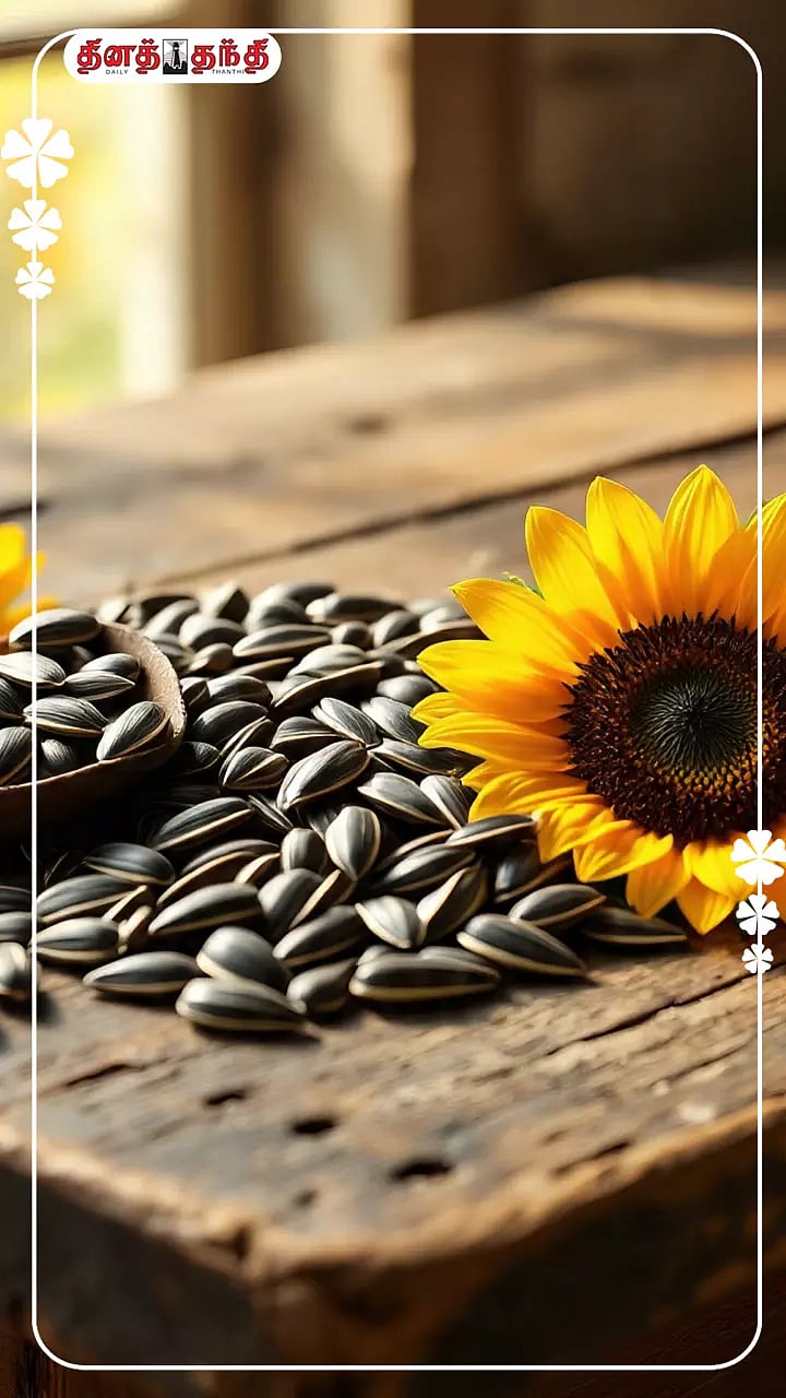 சூரியகாந்தி விதை ரத்த சர்க்கரை அளவை கட்டுக்குள் வைக்க உதவுகிறது..சூரியகாந்தி விதை துத்தநாகம், செலினியம், வைட்டமின்கள் மற்றும் தாதுக்களின் சிறந்த மூலமாகும்..சூரியகாந்தி விதைகளில் புரதம் மற்றும் நார்ச்சத்து நிறைந்துள்ளது, இது உடல் எடையை கட்டுக்குள் வைத்திருக்க உதவுகிறது..சூரியகாந்தி விதைகள் ஆரோக்கியமான கொழுப்புகளின் சிறந்த மூலமாகும். இது இதய ஆரோக்கியத்தை ஆதரிக்கிறது..இதில் இருக்கும் வைட்டமின் ஈ உடலில் ஆக்ஸிஜனேற்ற அழுத்தத்தையும், வீக்கத்தையும் கட்டுப்படுத்த உதவுகிறது..அதிக நார்ச்சத்து கொண்ட சூரியகாந்தி விதைகள் ஆரோக்கியமான செரிமானத்தை ஊக்குவிக்கின்றன..இதிலுள்ள வைட்டமின் ஈ, செலினியம் மற்றும் தாமிரம் போன்ற ஆக்ஸிஜனேற்றிகள் உள்ளன. இவை புற்றுநோயை எதிர்த்து போராட உதவுகிறது..சூரியகாந்தி விதைகளில் உடலின் ஹார்மோன் சமநிலையை கட்டுப்படுத்தும் என்சைம்கள் நிறைந்துள்ளன..Explore