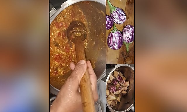 வெங்காயம் வதங்கியதும் தக்காளியை சேர்த்து நன்றாக கரைய வதக்கவும். அதன் பிறகு ஊற வைத்த கத்திரிக்காயை சேர்த்து மெதுவாக கிளறவும்.