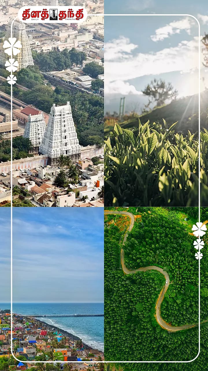 சென்னை: மெரினா கடற்கரை....ஒகேனக்கல்: காவிரியில் இருந்து வெளியேறும் நீர்வீழ்ச்சி. இது அநேக மக்கள் விரும்பும் சுற்றுலாத்தலம் ஆகும்..மதுரை: மீனாட்சிஅம்மன் கோவில் மற்றும் பல இடங்கள் உள்ளன..கன்னியாகுமரி: இந்த இடம் அழகான சூரிய அஸ்தமனம் மற்றும் சூரிய உதய காட்சிகளுக்கு பெயர் பெற்றது..ஊட்டி: தமிழ்நாட்டின் நீலகிரி மலைப்பகுதியில் உள்ள ஒரு பிரபலமான மலைவாசஸ்தலம் ஆகும்..கொடைக்கானல்: மலைகள்,காடுகள் மற்றும் ஏரிகளின் இயற்கை அழகை ரசிக்க இது ஒரு சிறந்த இடம்..கோயம்புத்தூர்:தமிழ்நாட்டின் இரண்டாவது பெரிய நகரம் மற்றும் ஈஷா யோகா மையம் உலகம் முழுவதிலுமிருந்து மக்களை ஈர்க்கிறது..பாண்டிச்சேரி: ஸ்ரீ அரவிந்தோ ஆசிரமம் இருப்பதால் ஆன்மிக ஆர்வலர்கள் அடிக்கடி வருவதால் இது ஒரு முக்கிய சுற்றுத்தலமாக உள்ளது..திருவண்ணாமலை: இங்கு அண்ணாமலையார் கோவில் மற்றும் பல இடங்கள் உள்ளன.