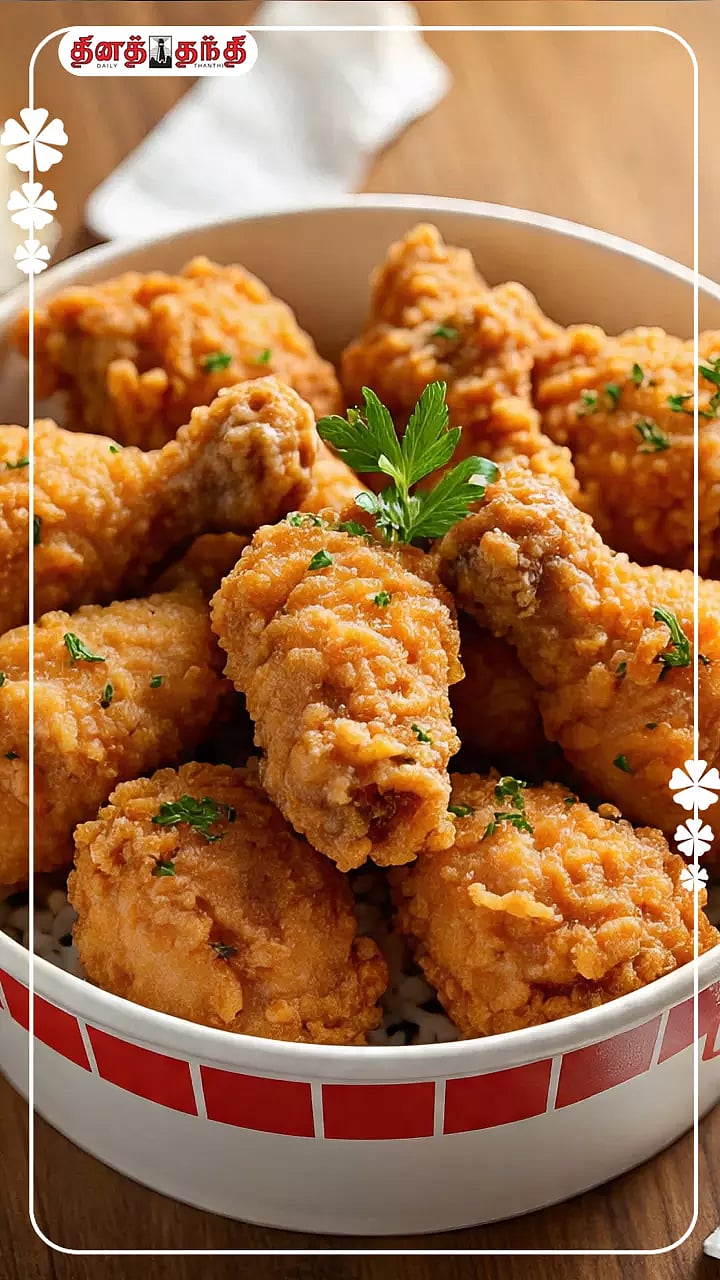 சிக்கன் லெக் பீஸ் – 4 ,பூண்டு பேஸ்ட் – சிறிதளவு, உப்பு – சிறிதளவு, தயிர் – தேவையான அளவு, மைதா – 100 கிராம், மிளகுத்தூள் – சிறிதளவு, மிளகாய்த்தூள் – சிறிதளவு, முட்டை ,கார்ன் மீல்ஸ் – 100 கிராம் ஆகியவை..ஒரு பவுலில் தயிரை ஊற்றி அதில் தண்ணீர் சேர்த்து மோர் போன்று தயார் செய்யவும்..பின் அதில் மைதாவினை சேர்த்து அதனுடன் பூண்டு பேஸ்ட், தேவையான அளவு உப்பு சேர்த்து கரைத்துக்கொள்ளவும்..அடுத்து அதில் சிக்கனை போட்டு அதனை அப்படியே 2 மணிநேரம் வரை ஊறவைக்கவும்..பிறகு ஒரு தட்டில் மைதா, மிளகுத்தூள், மிளகாய்த்தூள் மற்றும் கார்ன் மீல்ஸ் சேர்த்து நன்றாக கலந்து வைத்துக்கொள்ளவும்..பிறகு மற்றொரு பவுலில் முட்டையை உடைத்து நன்றாக கலக்கவும்..பிறகு ஊற வைத்த சிக்கனை இந்த முட்டையில் நனைத்து, கலந்து வைத்த மாவில் உருட்டி மீண்டும் முட்டையில் நனைத்து அதனை வேறொரு தட்டில் வைக்கவும்..பிறகு ஒரு கடாயில் எண்ணெய் ஊற்றி சூடானதும், தயார் செய்த சிக்கனை எண்ணெயில் போட்டு பொரித்து எடுத்தால் சுவையான K F C பாணியில் சிக்கன் தயார்..Explore