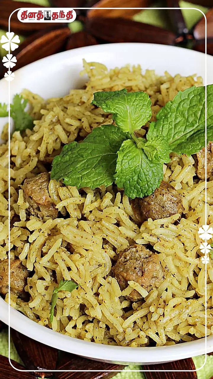 தேவையான பொருட்கள் : பாஸ்மதி அரிசி - 1 கப், மீல்மேக்கர் - 1 கப், உப்பு - தேவைக்கு, வெங்காயம் - 1, தக்காளி - 1, பச்சை மிளகாய் - 2,மிளகுத்தூள் - 1/4 டீஸ்பூன், சீரகத்தூள் - 1/4 டீஸ்பூன், இஞ்சி-பூண்டு விழுது - 1/2 டீஸ்பூன், பட்டை தூள், கிராம்புத் தூள், சோம்பு தூள் - தலா 1/4 டீஸ்பூன்,பிரிஞ்சி இலை - சிறிது, புதினா, கொத்தமல்லித்தழை - 1 கைப்பிடி, நெய் + எண்ணெய் - 2 டீஸ்பூன்.