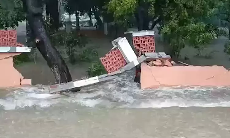 திருவண்ணாமலை மாவட்டத்தில் பெய்து வரும் கனமழையால் வேங்கி கால் ஏரி நிரம்பி, உபரி நீர் சாலையில் பெருக்கெடுத்து ஓடியதால் ஆட்சியர் குடியிருப்பு சுற்றுச்சுவர் இடிந்து விழுந்து சேதம் அடைந்துள்ளது. மேலும் சுற்றுச்சுவர் இடிந்து விழுந்ததில் மாவட்ட ஆட்சியர் வீட்டிற்குள் வெள்ளநீர் புகுந்துள்ளது. அதனை வெளியேற்றும் பணியில் மாநகராட்சி ஊழியர்கள் ஈடுபட்டுள்ளனர்.