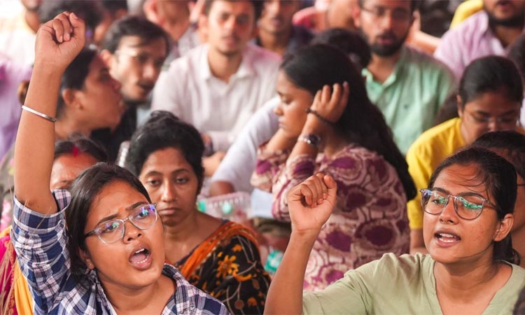 கொல்கத்தாவில் மாநில சுகாதார துறையின் தலைமையகமான ஸ்வஸ்த்ய பவனுக்கு வெளியே இளநிலை மருத்துவர்கள் மூன்றாவது நாளாக தர்ணா போராட்டத்தில் ஈடுபட்டுள்ளனர்.