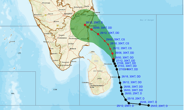 இந்த புயலானது பின்னர் ஆழ்ந்த காற்றழுத்த தாழ்வு மண்டலமாக மாறி வரும் 30-ம் தேதி காலை காரைக்கால் மற்றும் மகாபலிபுரம் இடையே வட தமிழ்நாடு-புதுச்சேரி கடற்கரையை கடக்கும் என்று எதிர்பார்க்கப்படுவதாக இந்திய வானிலை ஆய்வு மையம் தெரிவித்துள்ளது.