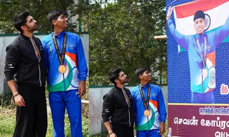 பைசன் பட நடிகர் துருவ் விக்ரம் கபடி வீரர் அபினேஷை நேரில் சந்தித்து பாராட்டியுள்ளார்.