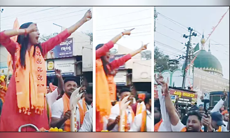 கர்நாடக மாநிலம் பெலகாவி மாவட்டம் மச்சே கிராமத்தில் இந்து அமைப்பினர் சார்பாக ஊர்வலம் நடத்தப்பட்டது. இந்த ஊர்வலத்தில் ஆண்கள், பெண்கள் என ஏராளமானோர் கலந்து கொண்டனர். அந்த ஊர்வலம் அன்சரி தர்கா அருகே வந்தபோது, ஒரு வாகனத்தில் நின்று கொண்டிருந்த பெண் ஒருவர் தனது கைகளால் தர்கா மீது அம்பு எய்வதுபோல் சைகை செய்தார்.
