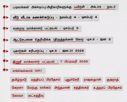 12 மாநிலங்களில் நவம்பர் 4-ம் தேதி முதல் சிறப்பு தீவிர திருத்தத்திற்கான கணக்கெடுப்பு துவங்கும். வாக்காளர் சிறப்பு தீவிர திருத்தப் பணியில் ஈடுபடும் அதிகாரிகளுக்கு நாளை முதல் பயிற்சி அளிக்கப்படும். வரைவு வாக்காளர் பட்டியல் டிச.9ஆம் தேதி வெளியாகும். சிறப்பு தீவிர திருத்த பணிகள் முடிக்கப்பட்டு 2026ம் ஆண்டு பிப்ரவரி 7-ம் தேதி இறுதி வாக்காளர் பட்டியல் வெளியிடப்படும்