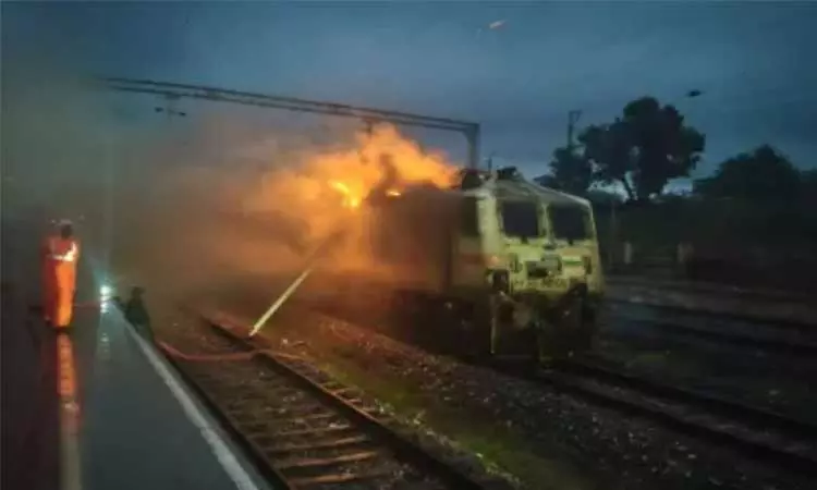 எஞ்சினில் திடீரென தீப்பற்றி எரிந்ததையடுத்து லோகோ பைலட் உடனடியாக ரெயிலை நிறுத்தினார்.