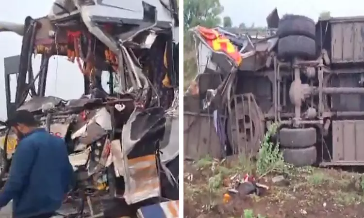 இதனால் சாலையில் முன்னால் சென்ற பஸ் மீது மோதி விபத்துக்குள்ளானது. இந்த விபத்தில் பஸ் சாலையில் கவிழ்ந்தது. விபத்தில் நம்தேவ் சூர்யவன்ஷி (வயது 40) மற்றும் நிதின் தேவர்சே (35) ஆகிய இருவரும் சம்பவ இடத்திலேயே பரிதாபமாக உயிரிழந்தனர்.