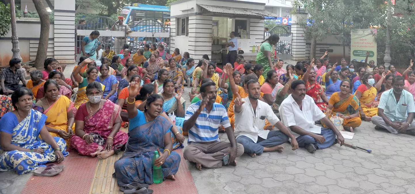 புதுச்சேரி ரொட்டி பால் ஊழியர்கள் தங்களுக்கு நிலுவை சம்பளத்தை உடனடியாக வழங்க வேண்டும், சட்டமன்றத்தில் முதல்-அமைச்சர் ரங்கசாமி அறிவித்த குறைந்தபட்ச ஊதியம் ரூ.10 ஆயிரத்தை வழங்க வேண்டும் என்பது உள்பட பல்வேறு கோரிக்கைகளை வலியுறுத்தி வருகின்றனர். அவர்கள் தங்கள் கோரிக்கைகளை வலியுறுத்தி இன்று கல்வித்துறை அலுவலக நுழைவாயில் கேட்டை இழுத்து மூடி முற்றுகையிட்டு போராட்டம் நடத்தினர். போராட்டத்திற்கு ரொட்டி பால் ஊழியர்கள் சங்க ஒருங்கிணைப்பாளர் மாறன் தலைமை தாங்கினார். இதில் ஊழியர்கள் பலர் கலந்துகொண்டனர். அவர்கள் கல்வித்துறைக்கு எதிராக கோஷங்கள் எழுப்பினர்.
