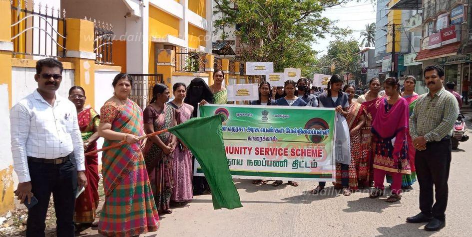 காரைக்கால் அன்னை தெரசா அரசு பெண்கள் மேல்நிலைப்பள்ளியில் சமுதாய நலப்பணி திட்டம் சார்பில், பிளாஸ்டிக் விழிப்புணர்வு ஊர்வலம் இன்று நடந்தது.