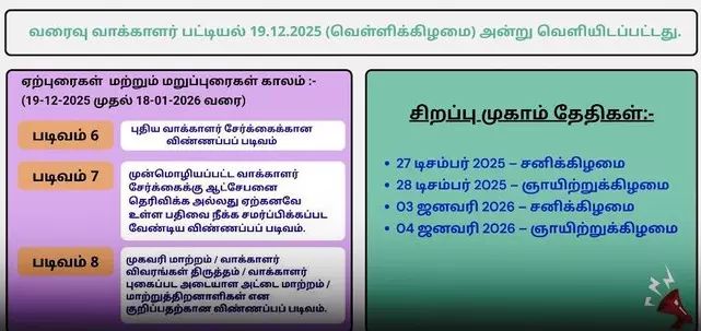 இந்த நிலையில், வாக்காளர் பட்டியலில் பெயர் சேர்க்க, திருத்தம் செய்ய 4 நாட்கள் சிறப்பு முகாம் நடைபெறும் என்று தமிழக தலைமை தேர்தல் அதிகாரி அர்ச்சனா பட்நாயக் அறிவித்துள்ளார். இந்த சிறப்பு முகாம் வருகிற 27,28-ம் தேதி (சனி, ஞாயிறு) மற்றும் ஜனவரி 3,4 (சனி, ஞாயிறு)ஆகிய தேதிகளில் தமிழகம் முழுவதும் 75 ஆயிரம் வாக்குச்சாவடிகளில் நடைபெறுகிறது. வாக்காளர் பட்டியலில் பெயர் சேர்க்க இதுவரை 6.11 லட்சம் பேர் விண்ணப்பித்துள்ளனர்.