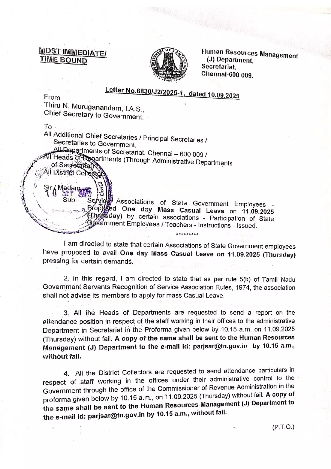 அரசு ஊழியர்களை தற்செயல் விடுப்பு எடுக்க வற்புறுத்தினால் நடவடிக்கை.. தலைமைச்செயலாளர் எச்சரிக்கை