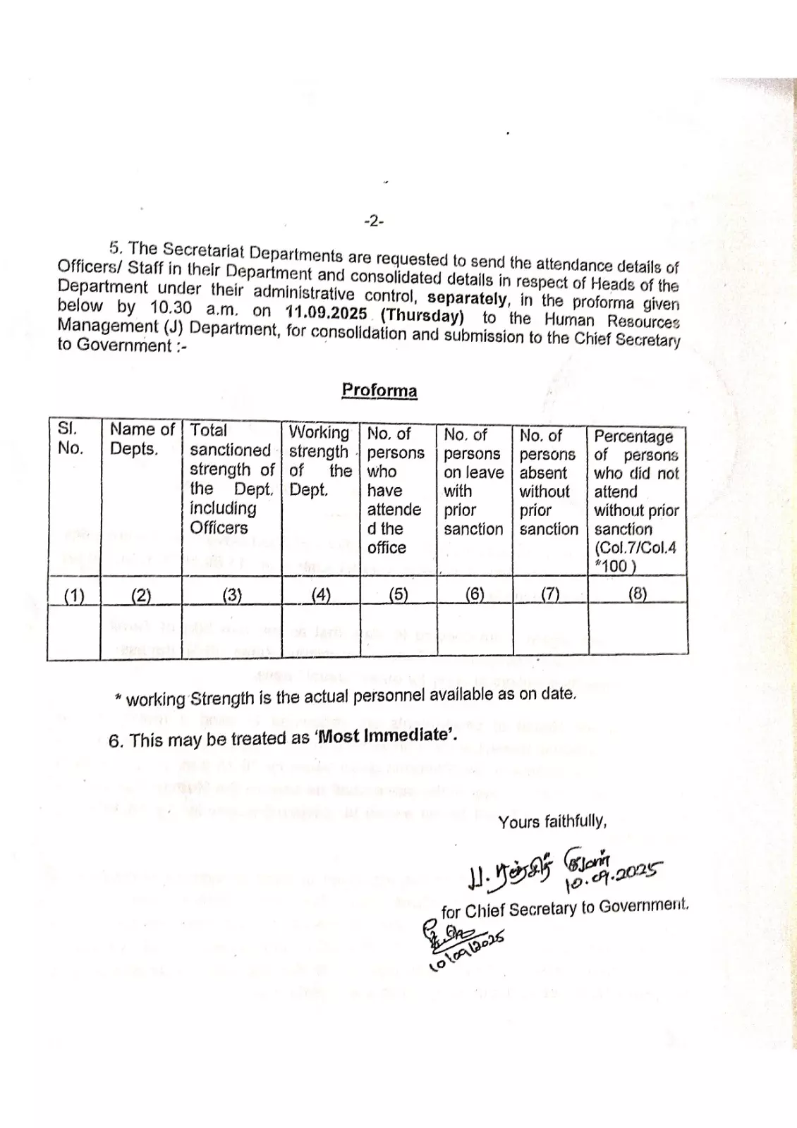 இதனை கருத்தில் கொண்டு அரசு ஊழியர்கள் வருகையை உறுதி செய்யும் வகையில் அவர்களது வருகையை பதிவு செய்து அதுதொடர்பான பதிவேட்டை காலை 10.30 மணிக்குள் சம்பந்தப்பட்ட துறை செயலாளர்கள் மற்றும் கலெக்டர்களுக்கு துறைகளின் பிரிவு அதிகாரிகள் அனுப்பி வைக்க வேண்டும்.