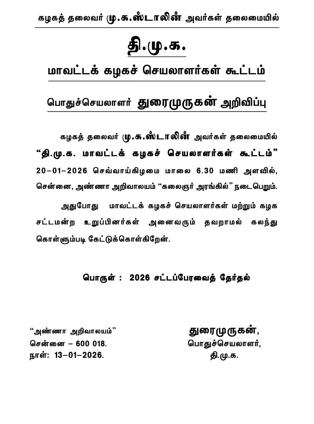 ”திமுக தலைவர் மு.க.ஸ்டாலின் தலைமையில் 20-01-2026 (செவ்வாய்கிழமை) மாலை 5.30 மணிக்கு திமுக மாவட்ட செயலாளர்கள் கூட்டம் சென்னை அறிவாலயம், கலைஞர் அரங்கில் நடைபெறுகிறது. அப்போது மாவட்ட செயலாளர்கள், சட்டமன்ற உறுப்பினர்கள் அனைவரும் தவறாமல் கலந்துகொள்ளும்படி கேட்டுக்கொள்கிறேன்."