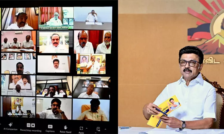 திமுக தலைவரும், முதல்-அமைச்சருமான மு.க.ஸ்டாலின் தலைமையில் திமுக மாவட்ட செயலாளர்கள் கூட்டம் இன்று காணொலி காட்சி வாயிலாக நடைபெற்றது. இந்த கூட்டத்தில் 'ஓரணியில் தமிழ்நாடு-உறுப்பினர் சேர்க்கை' குறித்து விவாதிக்கப்பட்டது.