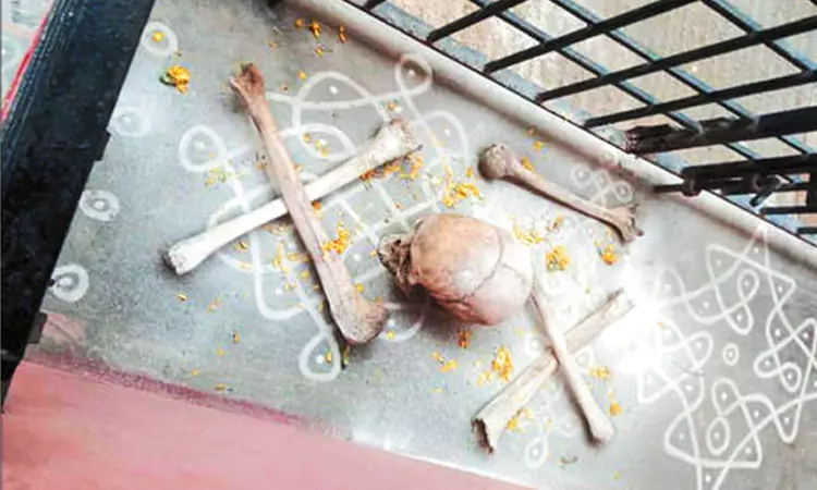 வீட்டு வாசலில் கிடந்த மனித மண்டை ஓடு, எலும்புகள் - பில்லி சூனியம் வைத்ததாக பீதி