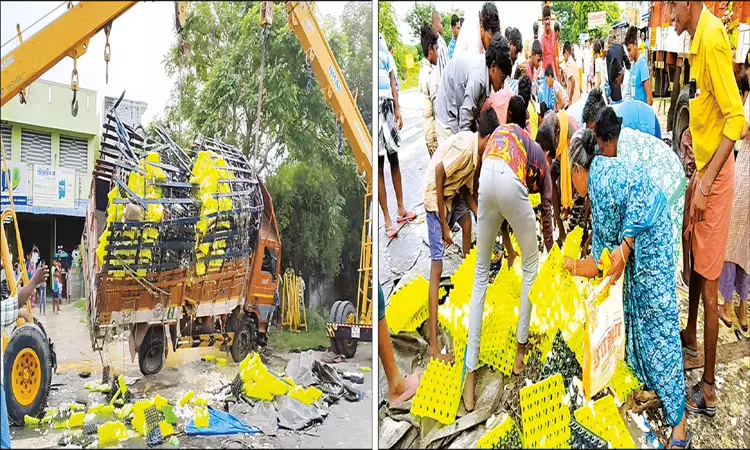 மேலும் சாலையில் கவிழ்ந்து கிடந்த லாரியை கிரேன் மூலம் போலீசார் அப்புறப்படுத்தினர். அப்போது லாரியில் இருந்த ஏராளமான முட்டைகள் பிளாஸ்டிக் அட்டைகளுடன் கீழே விழுந்தது. இதை பார்த்த பொதுமக்கள் உடையாத முட்டைகளை சேகரித்து அள்ளிச்சென்றனர். இது தவிர சிலர் உடைந்த முட்டைகளையும் பிளாஸ்டிக் பைகளில் சேகரித்து சென்றதையும் காணமுடிந்தது.