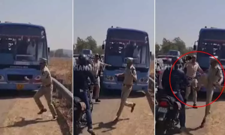 கர்நாடக முதல்-மந்திரி வருகை; போக்குவரத்தை சரிசெய்ய பைக் ஓட்டுநரை எட்டி உதைத்த போலீஸ் அதிகாரி