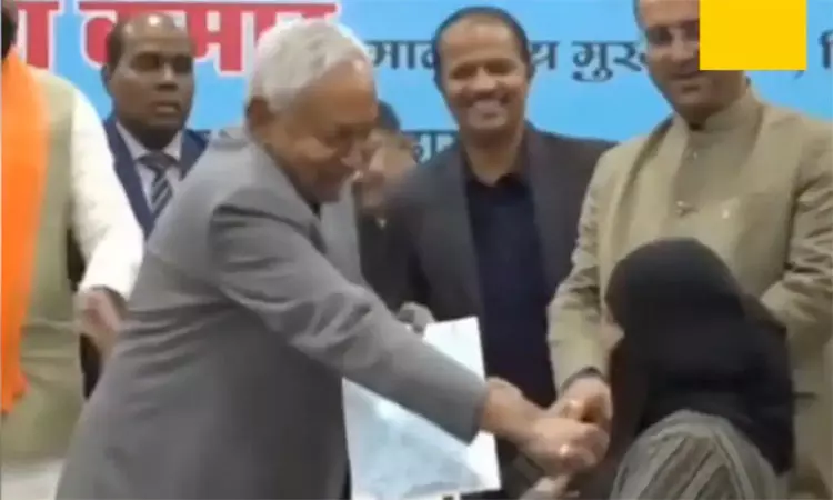 பெண் டாக்டரின் ஹிஜாப்பை முதல்-மந்திரி நிதிஷ் குமார் வலுக்கட்டாயமாக விலக்கிய வீடியோ கடும் பரபரப்பை ஏற்படுத்தி உள்ளது.