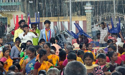 பூம்புகார்: பாமக மகளிர் மாநாட்டில் திடீரென மழை பெய்ததால், இருக்கைகளை தலையில் வைத்து மாநாட்டினை பார்வையிட்டு வரும் மக்கள்.