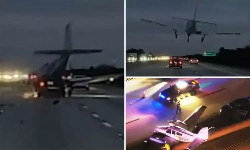 சாலையில் தரையிறங்கிய சிறிய ரக விமானம்: கார் மீது மோதி விபத்து