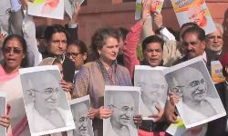 மகாத்மா காந்தி ஊரக வேலைவாய்ப்பு திட்டத்திற்கு மாற்றான மசோதாவிற்கு எதிர்ப்பு தெரிவித்து நாடாளுமன்ற வளாகத்தில் உள்ள காந்தி சிலை முன்பு இந்தியா கூட்டணி கட்சி எம்.பி.கள் ஆர்ப்பாட்டம் நடத்தினர்.
