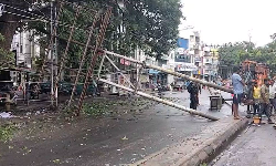கனமழை காரணமாக, கோவை காந்திபுரம் வி.கே.கே மேனன் சாலையில் மின் கம்பம் சாய்ந்து சாலையின் நடுவே விழுந்ததால் போக்குவரத்து பாதிக்கப்பட்டுள்ளது. காவல்துறை உதவியுடன் அப்பகுதியில் போக்குவரத்து மாற்றம் செய்யப்பட்டு, சரி செய்யும் பணியில் மின் வாரியத்தினர் ஈடுபட்டு வருகின்றனர்.