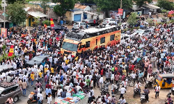 விஜய்யை வரவேற்க, தவெக கொடியை கையில் ஏந்தியபடி தொண்டர்கள் உற்சாகமாக காத்திருக்கின்றனர். தற்போது விஜய் தனது பிரசார பஸ்சில் புறப்பட்டுள்ளார்.