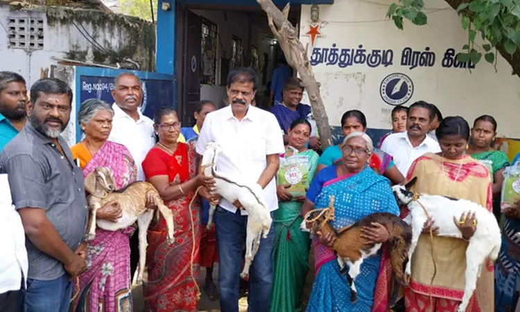 தி.மு.க. மாநில இளைஞரணி செயலாளரும், துணை முதல்-அமைச்சருமான உதயநிதி ஸ்டாலினின் 48வது பிறந்த நாளை முன்னிட்டு தூத்துக்குடியில் திரைப்பட தயாரிப்பாளரும், தி.மு.க. பிரமுகருமான பி.டி.செல்வக்குமார் 48 பேருக்கு ஆட்டுக்குட்டிகளையும், அரிசி பைகளையும் வழங்கினார்.