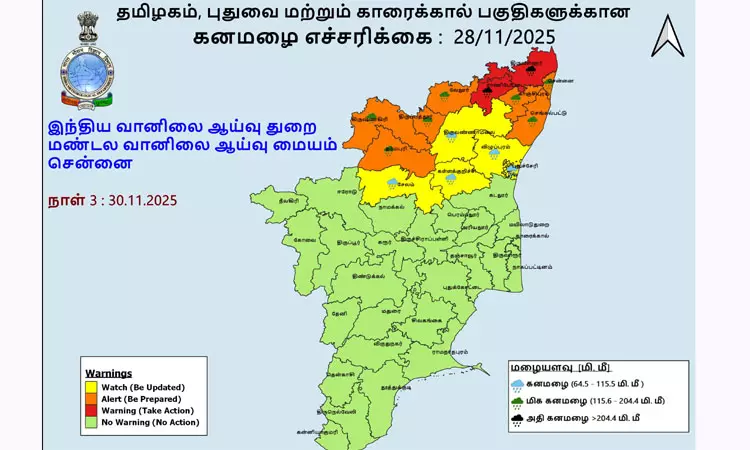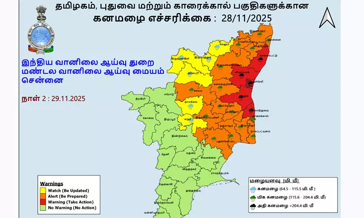 நாளை 29-11-2025: செங்கல்பட்டு, விழுப்புரம், கடலூர், மயிலாடுதுறை, மற்றும் புதுச்சேரியில் அதிகனமழை பெய்ய வாய்ப்புள்ளதாகவும், சென்னை, திருவள்ளூர், ராணிப்பேட்டை, காஞ்சிபுரம், திருவண்ணாமலை உள்ளிட்ட 14 மாவட்டங்களில் மிக கனமழை பெய்ய வாய்ப்புள்ளதாகவும் சென்னை வானிலை ஆய்வு மையம் அறிவித்துள்ளது.