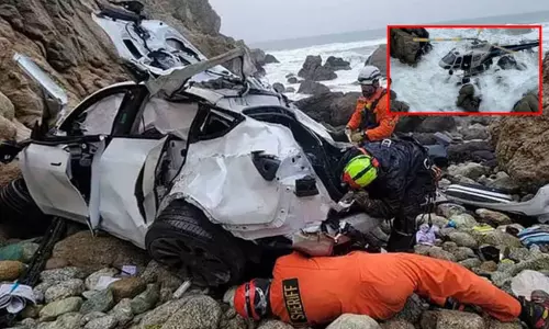 அமெரிக்காவில் தம்பதி, குழந்தைகளுடன் மலையில் கவிழ்ந்த டெஸ்லா கார்; திடுக் பின்னணி...