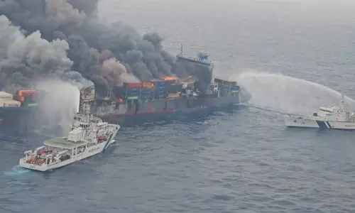 தீ கட்டுக்குள் வந்தநிலையில்.. சரக்கு கப்பலில் மீண்டும் கரும்புகை